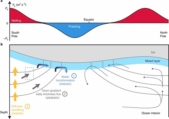 相较地球而言,土卫二上的海洋可谓截然不同。地球海洋占地球表面积的四分之三,平均深度只有3.6公里,相对较浅,受太阳光的照射,海洋顶部较暖,底部较冷,在大气流动的作用下产生了洋流现象。与之相比,土卫二上是覆盖整个星球的冰层及冰下海洋,其海洋的深度至少为30公里;海洋顶部受寒冷的冰层影响,温度较低,底部受地核加热,温度较高。然而,加州理工学院的研究生Ana Lobo(MS'17)在分析卡西尼号的探测数据,并参考Andrew Thompson的研究成果后认为:两个星球的洋流现象有相似之处!(Andrew Thompson是一位环境科学和工程学教授,致力于研究南极地区冰川与海水对彼此的影响以及因此而产生的洋流混合现象。)
