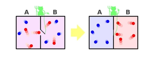 一段时间后,左边的隔间里就会充满慢速的“冷”粒子,而右边的隔间则会变得很热。这套孤立系统似乎会逐渐变得更有序而不是无序,因为两个可以区分的隔间比两个相同的隔间更有序。麦克斯韦似乎创造了一套违背熵增原理,进而也违背了宇宙法则的系统。