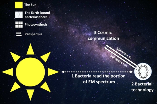 第三步是具有相似化学性质的微生物间的相互吸引与交流。如果其他星球的微生物共享碳基化学性质和新陈代谢(如DNA,蛋白质和其他生物分子),那么它们应该能够无缝衔接地整合到地球的细菌圈中。而相反的过程也是可能发生的。来自地球的微生物可以通过小行星进入太空,并在宇宙中的其他地方孕育生命。或者,人类作为未来的宇宙旅行者,可以凭借人类微生物种群充当微生物传播媒介。