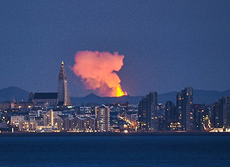 冰岛的法格拉达尔斯拉恩(Fagradalshraun)火山曾平静过一段时间,随后突然爆发,向空中喷出红色的熔岩间歇泉。人们在首都雷克雅未克也可以看到这一令人惊叹的景象。