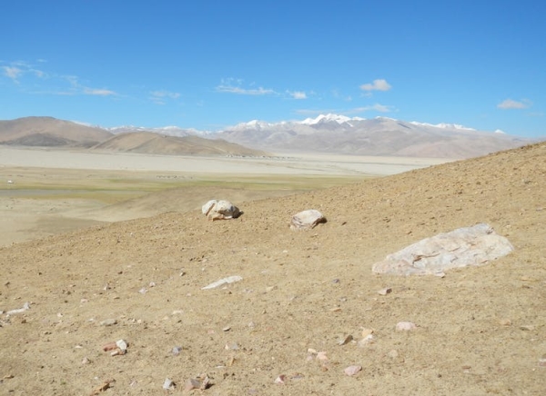 Su-re考古遗址西南方向的全景。注意前景中的大石块,上面有早期藏人采石的痕迹。 图片由作者Jan-Hendrik May提供