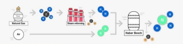 哈伯法(Harber-Bosch method):以氢气(由天然气热分解提取而成)和大气中的氮气为反应物,在高温高压条件下使用催化剂生成氨。(图片来源:KIMM)