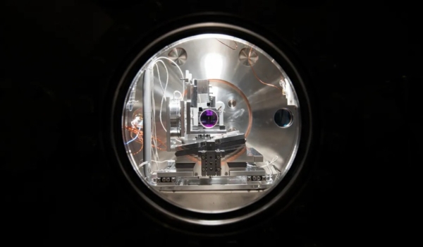 Markus Arndt实验室里干涉仪的高真空室,包含一块紫色镜面和一个由纳米电机驱动的可移动机械光栅。来源:Quantum Nanophysics Group