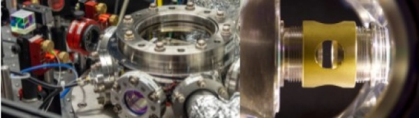 在Lukas Novotny实验室的真空室(左)内,两个光学透镜悬浮起了一粒二氧化硅纳米颗粒(右)。来源:ETH Zurich