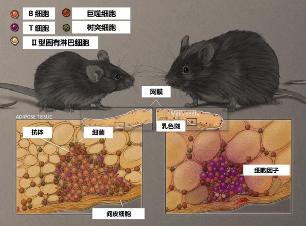 乳色斑是与脂肪相关的淋巴簇,它能过滤腹部液体。聚集的免疫细胞搜索致病性入侵者和内部损伤的信号,并产生适当的反应。然而,在肥胖个体中,这些细胞可能变得过度活跃,从而导致慢性炎症和自身免疫性反应的产生。