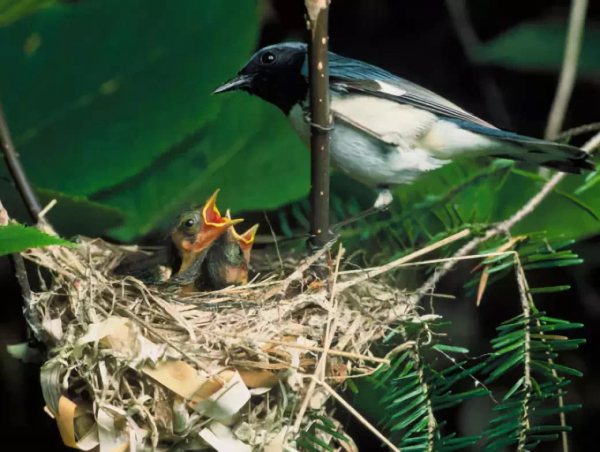 黑喉蓝林莺会偏向饥饿的雏鸟。乞食对雏鸟来说成本似乎不高,这表明相关现象不能用不利条件原理来模拟。图片来源:Steve Maslowski, USFWS