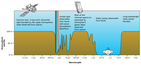 大气层对不同波段电磁波的吸收情况,纵轴为吸收率。大气对红外波段(波长约0.75微米至1毫米)吸收比较强,因此更适合在太空中观测红外波段。图片来源:Wikipedia