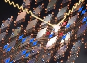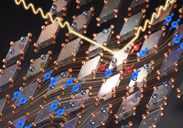 中子撞击二碲化铀的示意图。铀(灰色)和碲(棕色)的晶体被怀疑具有自旋三重态超导性,这种状态以自旋指向相同方向的电子对(蓝色)为特征。在中子散射实验中,射入的中子会使自旋翻转(红色)。来源:Jill Hemman/ORNL