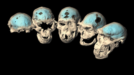 来自格鲁吉亚德马尼西(Dmanisi, Georgia)的五个保存完好的直立人头骨的虚拟重建,它们可以追溯到185万至177万年前。(图片来源:M. Ponce de León and Ch. Zollikofer/苏黎世大学)