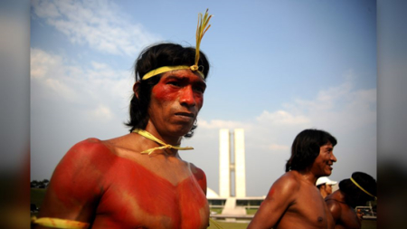 刚刚结束了传统原木比赛的一名巴西Xavánte男子,该比赛是2012年9月土著居民会议的一部分。Xavánte人被纳入了一项关于南美人和大洋洲人之间基因联系的新研究。(图片来源:Pedro Ladeira/法新社/GettyImages)