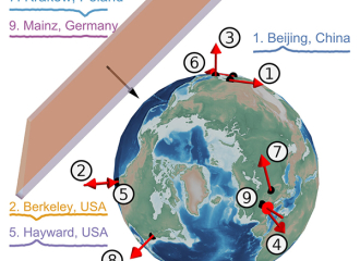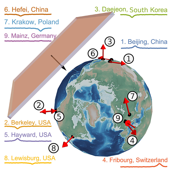 全球GNOME(用于搜索外来物理现象的光学磁强计全球网络,Global Network of Optical Magnetometers for Exotic Physics Searches)网络的示意图。(图片来源:Hector Masia Roig)