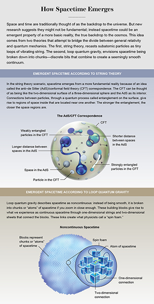 虽然弦理论和圈量子引力理论都认为时空是涌现的,但这两种理论所描述的涌现方式是不同的。弦理论认为,时空(或至少是空间)起源于一个看似不相关的系统的行为,即以纠缠的形式涌现。比如单个司机的集体行为造成交通堵塞。这些汽车不是由交通堵塞构成的,而交通堵塞是由汽车造成的。而另一种理论,在圈量子引力理论中,时空的涌现更像是一座由风中沙粒集体运动产生的倾斜沙丘。我们熟悉的平滑时空由时空中微小“颗粒”的集体行为产生;就像沙丘一样,时空中的这些厚实的晶体颗粒仍然是沙子,但它们看起来或表现得并不像起伏的沙丘。