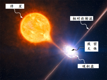 双星系统中较致密的天体(比如黑洞)吸收伴星的物质形成明亮的吸积盘并发射出X射线。来源:European Southern Observatory (ESO)