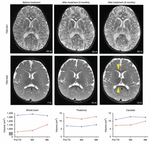 基因治疗前后脑部MRI解剖图以及部分脑组织体积比较。图片来源于文章:AAV gene therapy for Tay-Sachs disease