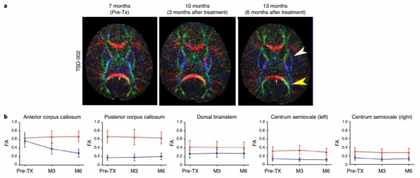 基因治疗前后脑MR扩散张量成像以及部分脑结构的定量分数各向异性(FA)比较。图片来源于文章:AAV gene therapy for Tay-Sachs disease