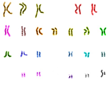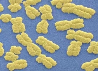 人类染色体的彩色扫描电子显微照片。图片来源:Andrew Syred/Science Source