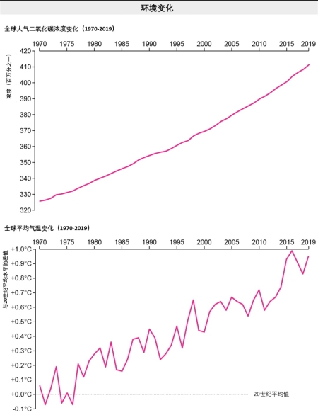 在下面两张图中,曲线显然正在势不可挡地上升,这正是全球变暖问题的核心。随着汽车数量、燃煤和天然气发电量的增加,大气中的二氧化碳含量呈稳步上升态势。如今,大气中二氧化碳的平均浓度已超过410ppm(百万分之一),而在1970年时约为325ppm,在19世纪工业革命前为280ppm。自前工业化时期(通常指1850-1900年)以来,大气中的二氧化碳捕获的多余热量已经使全球气温升高了约1℃。根据2015年通过的《巴黎协定》,各国同意将全球平均气温较前工业化时期的上升幅度控制在2℃以内,但首选目标是保持在1.5℃以下。到目前为止,人类为减排所做的努力还不足以遏制气温上升的幅度,以实现这些目标。