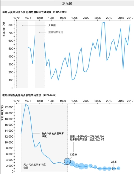 上图:1975-2019年从美国莫米河进入伊利湖的溶解活性磷含量变化。图片来源:Amanda Montañez/美国海德堡大学国家水质研究中心。下图:1972-2014年美国密歇根湖(北美五大湖之一)鱼类体内多氯联苯含量变化。图片来源:Amanda Montañez/美国环境保护署五大湖鱼类监测计划(Great Lakes Fish Monitoring and Surveillance Program)及五大湖大气沉降综合监测网络(Great Lakes Integrated Atmospheric Deposition Network)