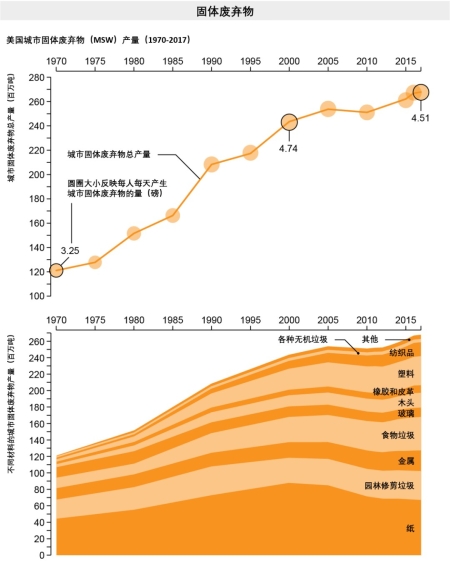 1970-2017年美国城市固体废物(MSW)总产量(上)和不同材料废弃物产量(下)的变化。图片来源:Amanda Montañez/美国环境保护署