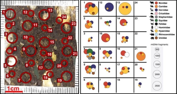 图注:左侧的圆圈为丹尼索瓦洞沉积土切片的钻孔采样位置,圆圈的大小即样本的大小;右侧则为从对应编号样本中复原的远古哺乳动物DNA,圆圈的颜色代表不同的动物种类,圆圈大小代表DNA碎片的多少。其中,编号为5和16的样本中分析出了尼安德特人的DNA。(图片来源:原文)