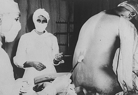 1933年,Jesse Peters医生和Eunice Rivers护士对一名身份不明的受试者进行腰椎穿刺。(图片来源:CDC/Public domain)