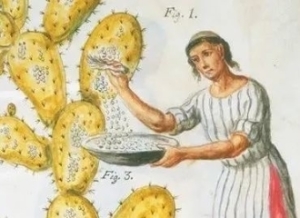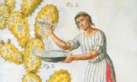 胭脂红的故事可以追溯到数千年前。中美洲的居民发现仙人掌上有时会长虫,如果用手捏走这些虫子,手上就会留下血红色的污渍。从此,人们开始尝试用胭脂虫为织物染色。到了16世纪,西班牙人被胭脂红染出的大胆明艳的颜色吸引,便记录下生产过程,并运送了成吨的昆虫干回到欧洲,想以此取代当时欧洲地区普遍使用的单调染料。