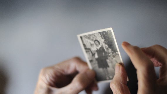 一位阿尔兹海默患者看着自己的照片(图片来源:AFP/Sebastien Bozon/Getty)
