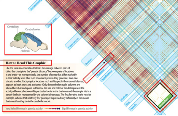 人们利用现有的相关研究进行数据可视化的开发。毕竟,数据可视化大师Jan Willem Tulp用图解法展示鼠类及人类大脑中的基因表达,也推动了科学家对我们今天所使用的热度图的研究。但是对我而言,这种抽象的可视化时常在实验室作为一个分析工具来使用,而不是与更多听众进行研究成果的交流。(如果你持相反意见,欢迎质疑,并把相关例证的链接附于评论区)