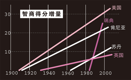 “弗林效应”(智商测试的成绩逐年增加的现象)在西方已经趋平,在肯尼亚却仍呈上升趋势,自20世纪80年代以来已经上升了25分。许多贫困国家还没有迈过提高生活水平这道门槛,当他们最终实现后,智商水平也将在世界范围内趋于一致。