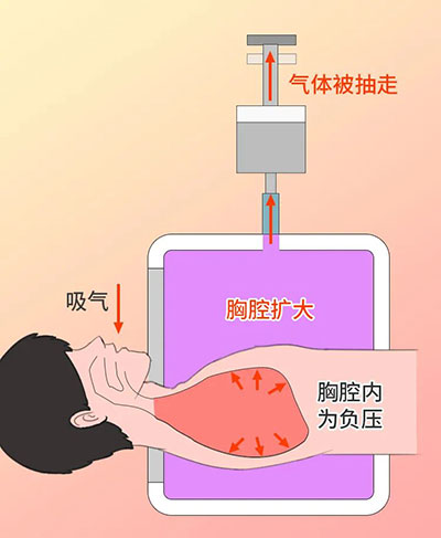 19世纪晚期,人们惊喜地发现,把空气推进肺部,不如把空气吸进肺部!当人体内负压增大时,胸腔肺泡内压会低于气压水平,外界空气就可以自动的流入体内,于是人们开始设计负压呼吸机。