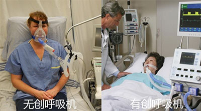 无创呼吸机只需要将面罩戴在口鼻上。在吸气时,呼吸机施加较高的压力;在呼气时,呼吸机施加较低的压力,这样就能模拟肺部正常呼吸的气压,帮助病人呼吸,而且不会给病人留下创伤。