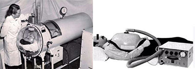 铁肺型呼吸机出现了,它是一只密闭的“金属桶”,病人的头颈部以下都要进入桶中,只露出头在外面呼吸空气。在桶的下面是一个电动的大风箱及人工操作杆。当风箱吸走桶内气体,胸腔容量会扩大,胸内的负压增大,空气就会被吸进入肺部。随后负压二代“胸甲”也开始应用。它改铁桶为坚硬的胸甲状罩子,罩子会紧贴胸壁两边,还紧贴颈部到臀部,比起铁肺式,这个护理起病人来更方便。