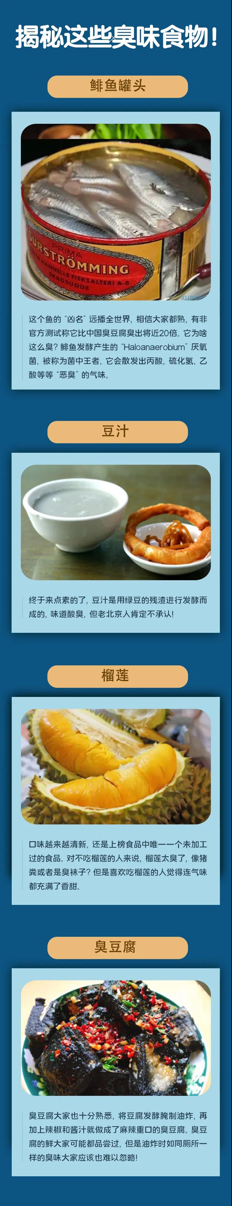 “越臭就越香!”,臭味食品中的氨基酸含量大约是新鲜食物氨基酸含量的6倍;发酵中的酶还会让原料中的淀粉或蛋白质转化成有机酸、酒精和酯类,产生一些口味让你眼前一亮的,具有特殊风味的物质。