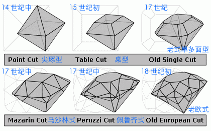 从佩戴原石到尖点式八面琢型,从桌型到玫瑰琢型,从马沙林式到老欧式……