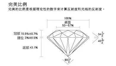 在此标准下,一粒钻石无论多大,都需要被切成57面,或者把亭部(即底部)切掉尖得到58面,呈三角形状(现在的切割工艺能做到更多的面了)。