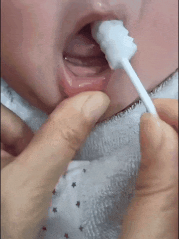 之后,他们开始注意在科科喝完奶之后喂几口水漱口,每天也都会用消毒清洁后的湿纱布或专门为小宝宝清洁用的口腔湿巾,轻轻擦拭清洁她的牙龈和舌苔,就像这样↓↓↓