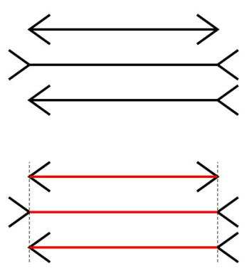 视觉上的大小、长度、面积、方向、角度等几何构成,和实际上测得的数字有明显差别的错觉,由图像本身的构造导致的称为几何学错觉,以其种类多而广为人知。比较经典的视觉图有:米勒-莱尔错觉:指两条等长平行线段,两端箭头向外的线段比两端箭头向内的线段看上去更长的现象。