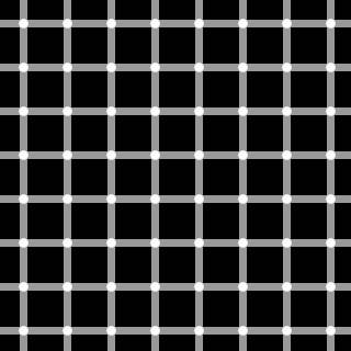 赫曼方格是最常被用来解释生理错视的作品。当你聚焦于黑色方格之间的白色空间时,你会发现其他的白色空间都变灰了。而当你单纯地看着图片时,上面会出现接二连三闪烁的黑色小点。