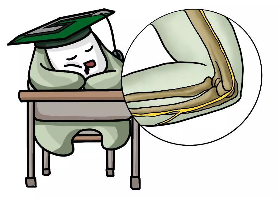 与此同时,伏案午睡的姿势需要手肘大幅度向外弯曲,头部和桌面同时对手肘部的“麻筋”施加压力,容易造成位于此处的尺神经出现损伤或病变,从而导致肌肉萎缩,手指酸痛麻木等症状。