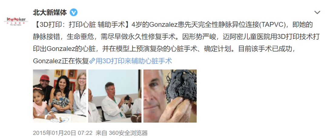2015年1月,迈阿密儿童医院有一位患有“完全型肺静脉畸形引流”的4岁女孩由于疾病呼吸困难免疫系统薄弱,心血管外科医生借助3D心脏模型的帮助,通过对小女孩心脏的完全复制3D模型,并在模型上预演复杂的心脏手术、确定计划,最终成功地为小女孩实施了永久手术,小女孩的血液恢复正常流动。