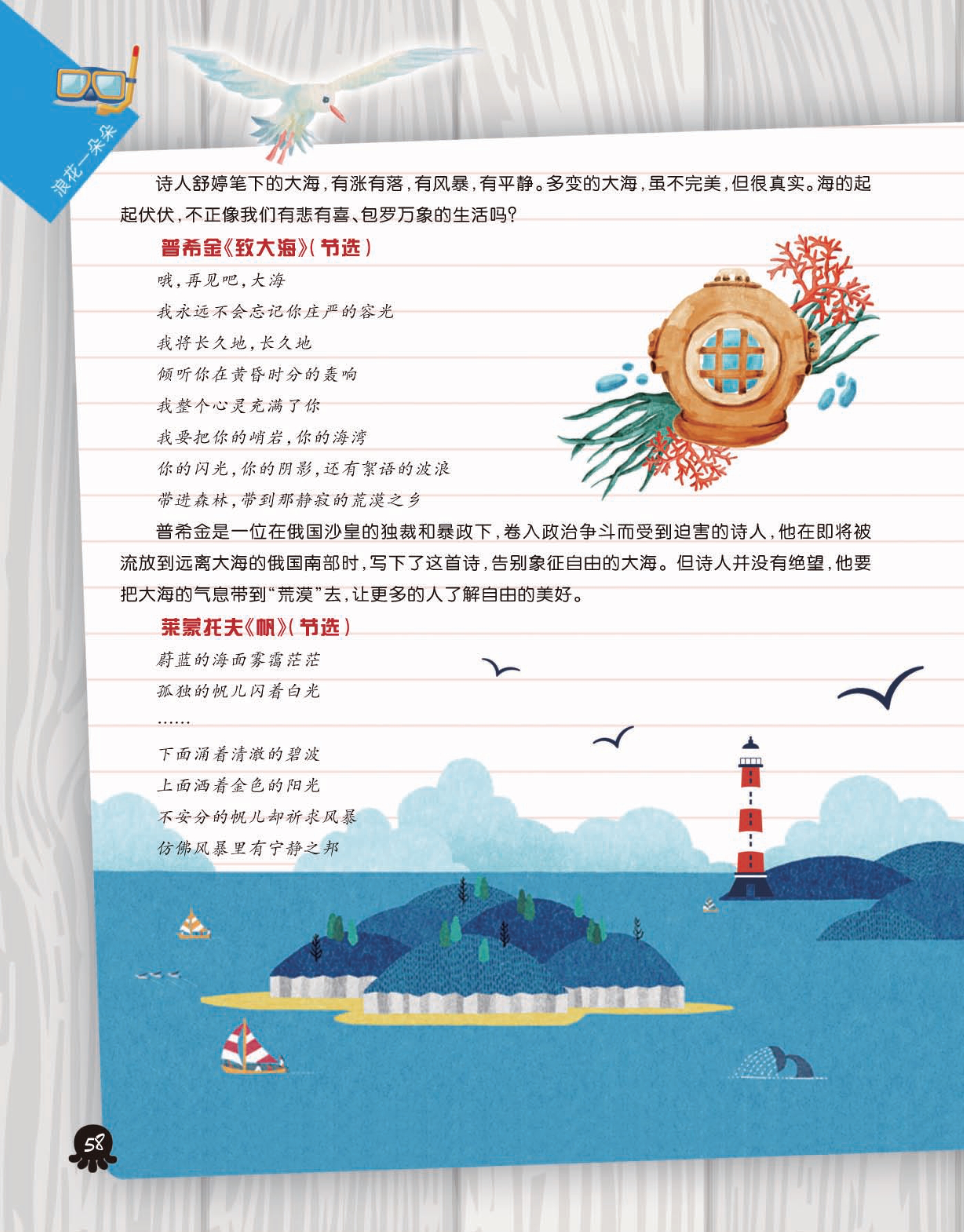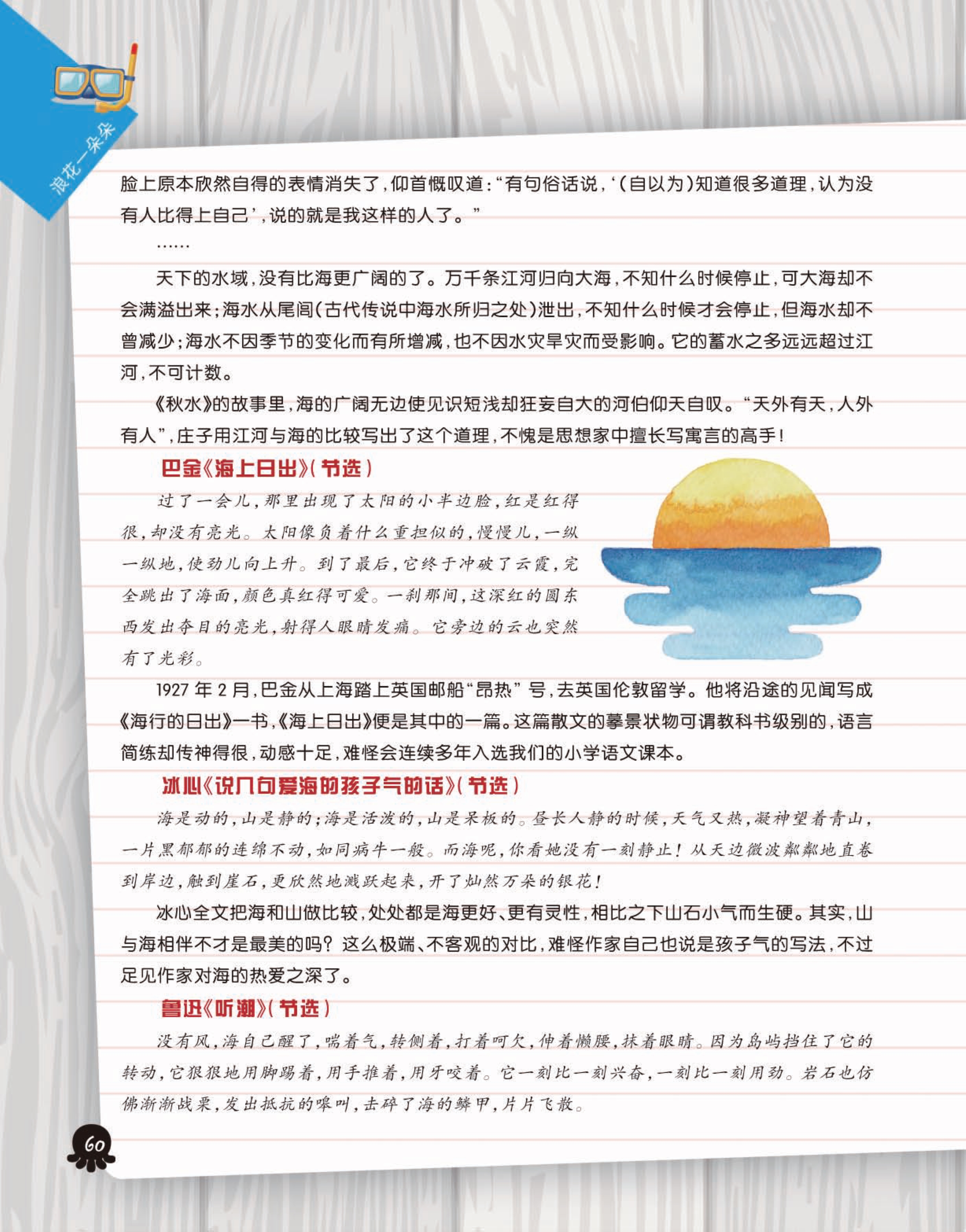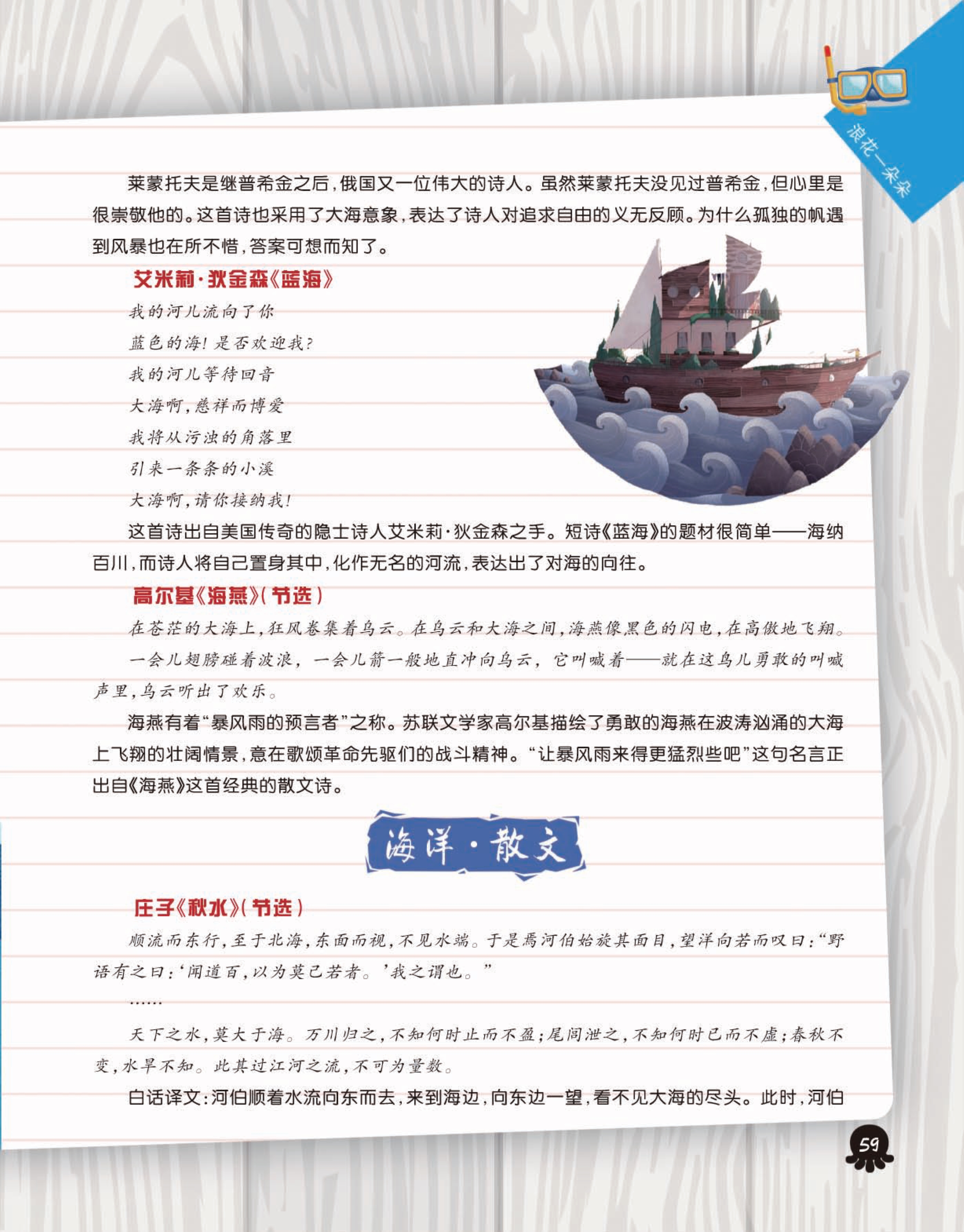 以图文并茂的形式介绍多姿多彩的海洋生物、地质、军事知识及沿海国家的海洋风光、名胜;讲述与海有关的各种神话、探险和寻宝故事等。