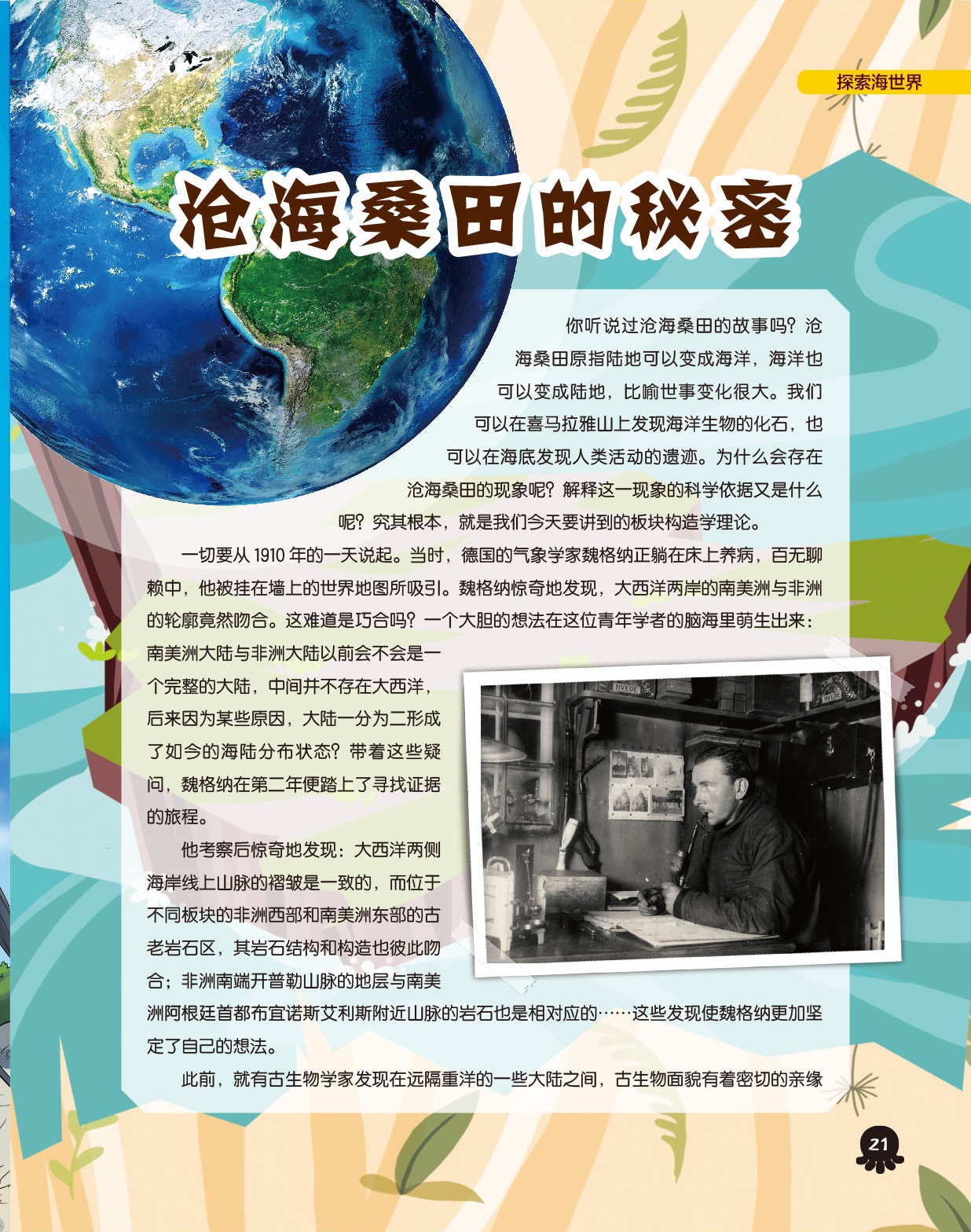 以图文并茂的形式介绍多姿多彩的海洋生物、地质、军事知识及沿海国家的海洋风光、名胜;讲述与海有关的各种神话、探险和寻宝故事等。