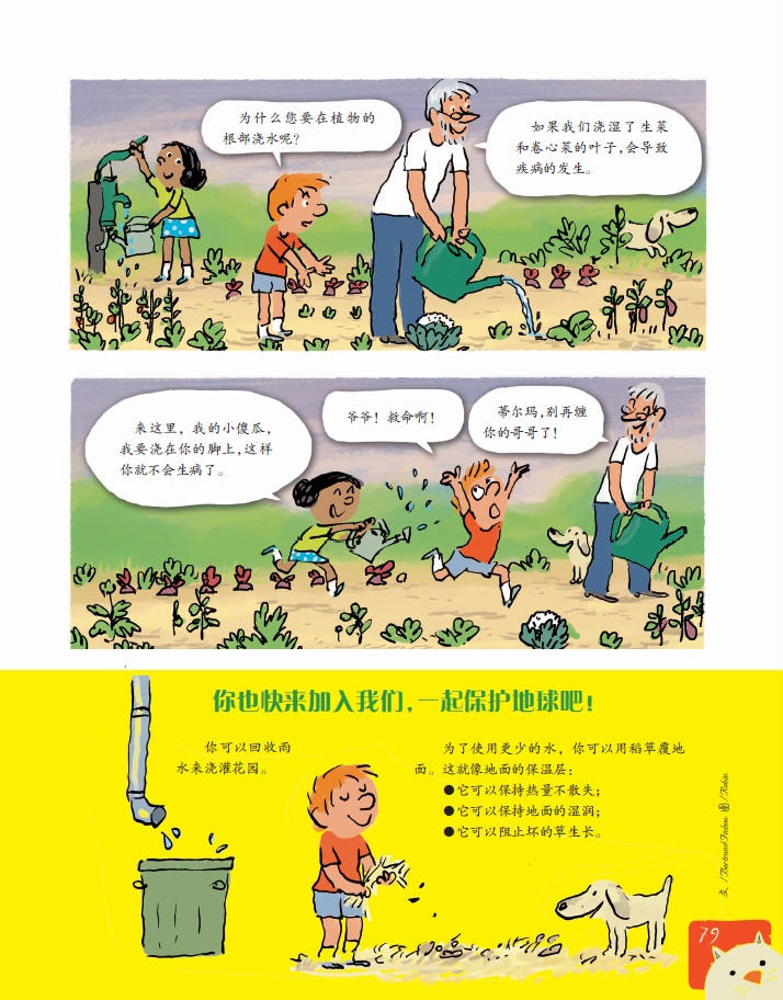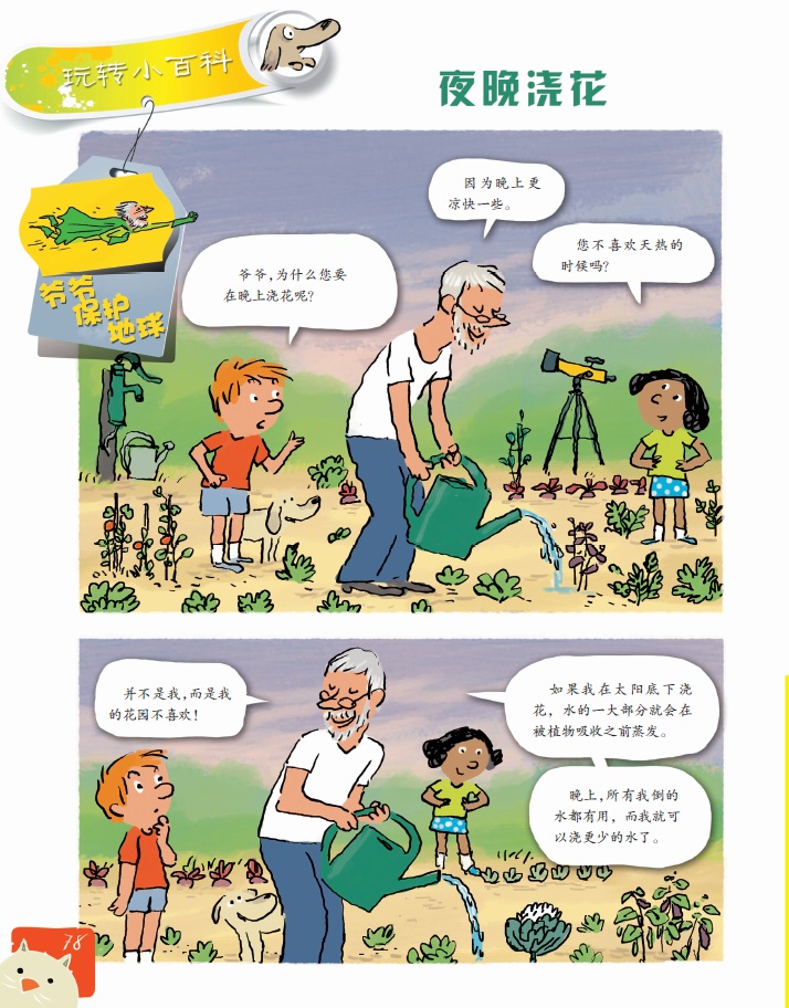 爷爷,为什么您要在晚上浇花呢?因为晚上更凉快一些。您不喜欢天热的时候吗?