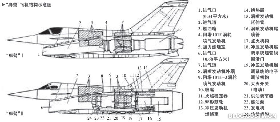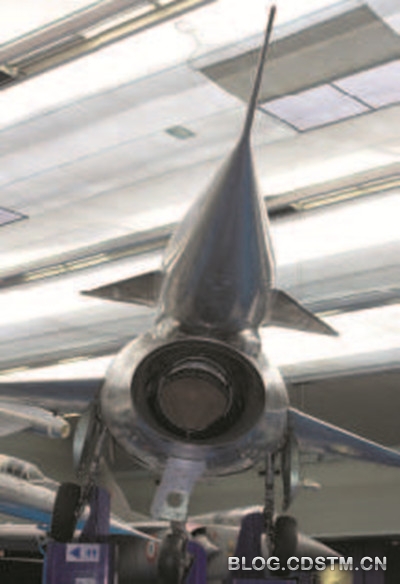 喷灯”等验证机上使用,这似乎和法国人发明了冲压发动机有关。“狮鹫”的涡喷发动机能单独工作,用于起飞(冲压发动机不能在零空速下产生动力,也不能让一架飞机从静止加速),而当空速超过1 000千米/小时,冲压发动机会提供额外的动力。和SR-71的J58发动机不同的是,“狮鹫”的动力完全是两台发动机。当然,冲压发动机没有任何旋转部件,位于主发动机后方,从某种意义上讲更像是额外的加力燃烧室。