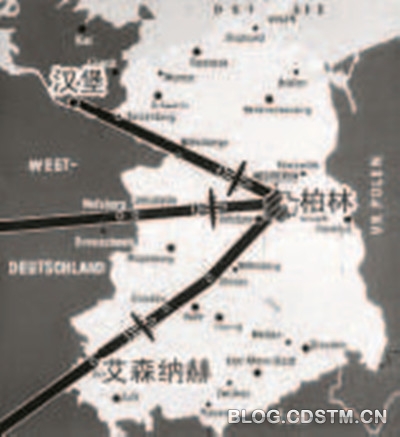 1948 年6 月,苏联开始了对柏林的交通封锁,历史上著名的“ 柏林空运”开始了。图为当时西方盟国对柏林实施空运的三条空中走廊,也是电子侦察机在苏占区仅有的飞行航线