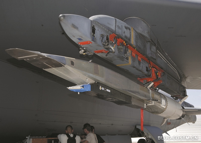 挂载由助推器和验证机组成的X-51A 试验系统,实际上X-51A是倒挂在B-52H 机翼下的,投放后需要发动机和这4 片尾翼配合翻转180°,使进气道在下方。而且在飞行中需要利用其保持飞行器稳定,一旦武器化后还需要利用其在空中巡航机动。但是由于X-51A 需要跨越亚声速、超声速和高超声速等多个飞行阶段,速度要从0.8 马赫一直提高到6 马赫以上,因此尾翼的设计十分特殊。外界分析认为,虽然前两次试验中尾翼均未发生问题,但不能证明其设计是可靠的。有可能是在助推火箭加速过程中尾翼载荷过大,造成其偏转失控或损毁,而导致后面的180°翻转无法实现,从而导致科研人员放弃了此次试验。