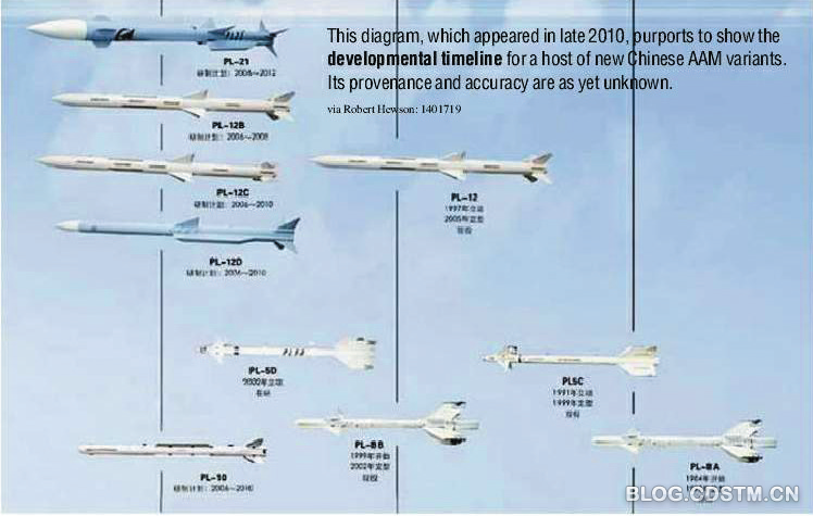 当然,中国空军的雄心绝不止于SD-10导弹,据2010年珠海航展公开的信息称,中国至少打造了三种新型增程空空导弹,按时间顺序分别是:SD-10(中国军方称“霹雳”12——PL-12),定型时间为2006~2008年;PL-12C(定型时间为2006~2010 年);PL-12D(采用冲压发动机,定型时间为2010 年)。据称,中国还有一种被称为PL-21的冲压式超远程空空导弹尚在研发中,预计定型时间为2012年。