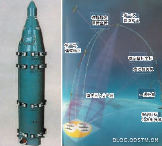 从原理上讲,导弹弹头在太空中飞行,只需很小的力和力矩就可使其姿态发生较大变化,因此使用小型固体(液体)火箭发动机或冷气喷管就可对弹头飞行弹道进行有效控制。对反舰弹道导弹而言,关键是控制信息的来源问题。从现有技术水平分析,有两种方式可获取弹道修正信息,一种是“战术战斧”方式,另一种是SS-N-13导弹方式。