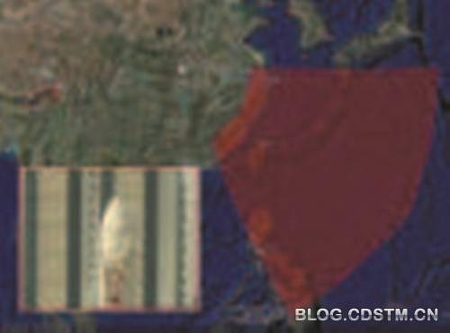 “ 超视距雷达与反舰弹道导弹”一文提供的中国超视距后向散射雷达探测范围示意图。左下角小图为央视截图中显示的中国遥感卫星整流罩