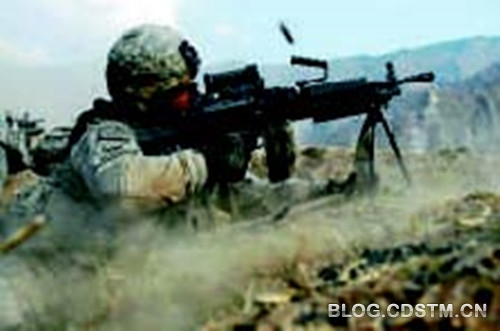 阿富汗战场上头戴MICH 头盔、正在射击的美军机枪手